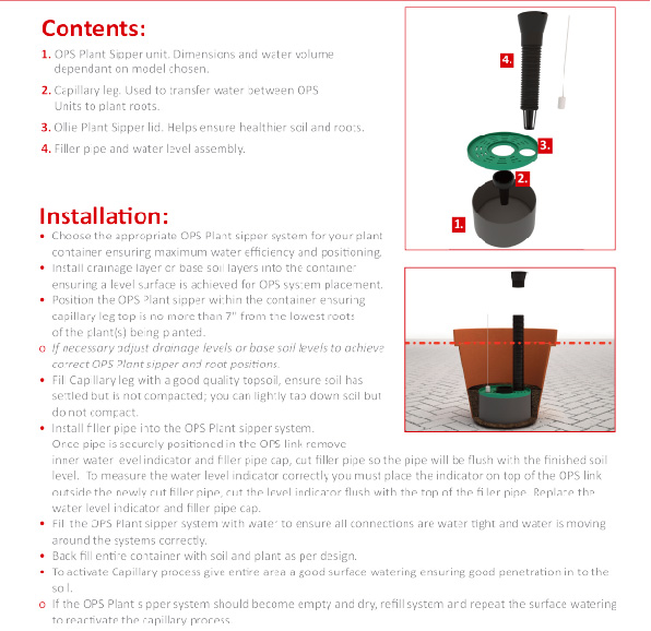 Place the Mona Plant Sipper (the round cup-like part) on to the level base layer. Be sure that the Capillary leg is not more than 7" from the roots of the plant. The Mona Plant Sipper can be installed at different depths to achieve this.
