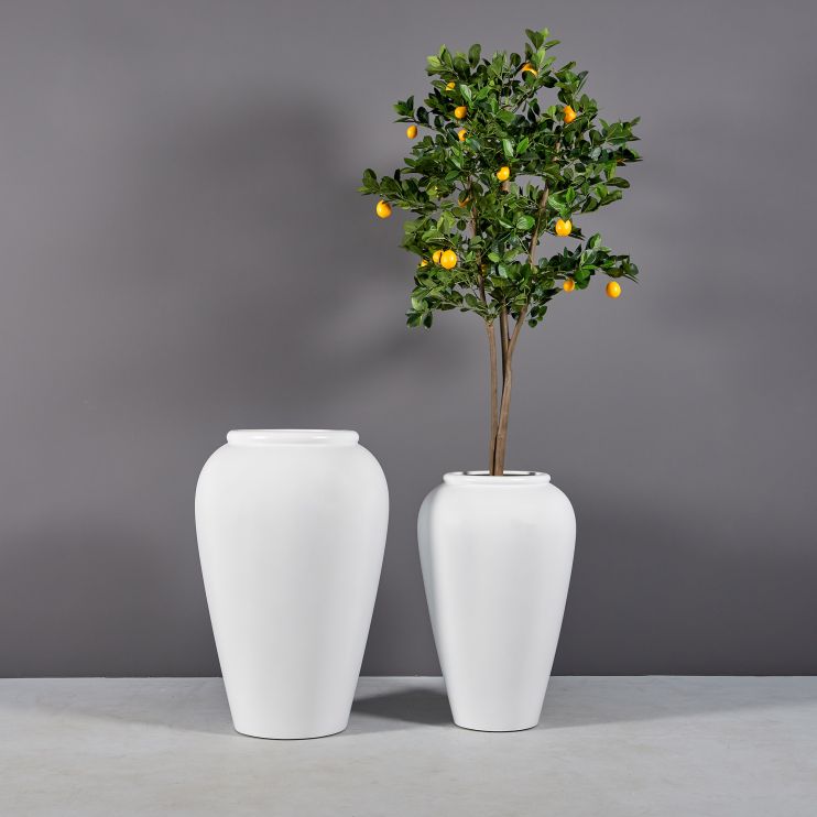 Add classic and elegant appeal with large urn planters perfect for any interior or exterior arrangement. Available in a range of extra large to smaller sizes, find a planter with the dimensions you need. Constructed out of fiberglass and recyclable plastic, it's easy to create a stunning residential or commercial arrangement that perfectly matches the aesthetic of your plant design